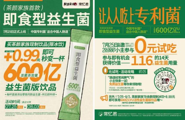 消费者不用再单独吃粉剂或者胶囊了,只要在购买茶颜家族现制冰饮时加上 0.99 元,就能升级为 600 亿 CFU "活性益生菌版"的特制饮品。