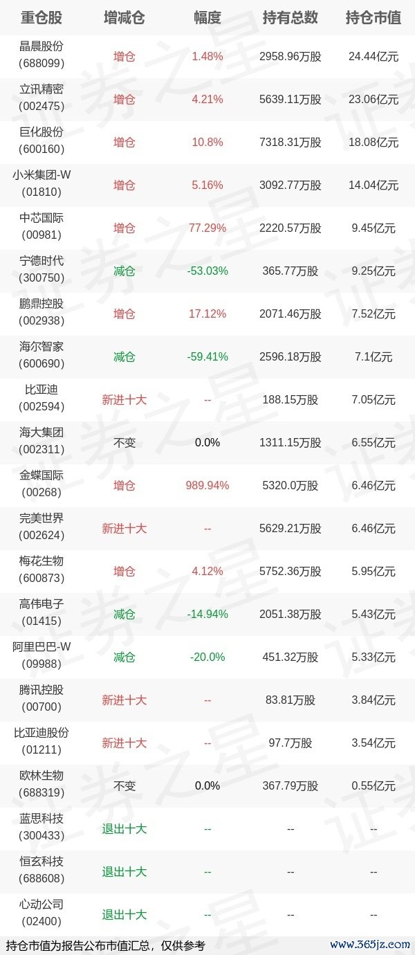 本站消息融可赢,4月22日兴证全球基金谢治宇旗下基金公布2025年一季报,综合其旗下各基金报告,港股持仓比重大幅增加,小米集团-W、中芯国际、金蝶国际等被增持,腾讯控股、比亚迪股份等新入十大重仓;另外,新能源汽车行业板块个股更受其关注,与上季度相比,立讯精密、巨化股份等被增持,比亚迪等新入十大重仓;目前其旗下基金综合持仓排名前三个股为晶晨股份、立讯精密、巨化股份。